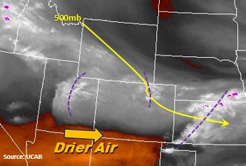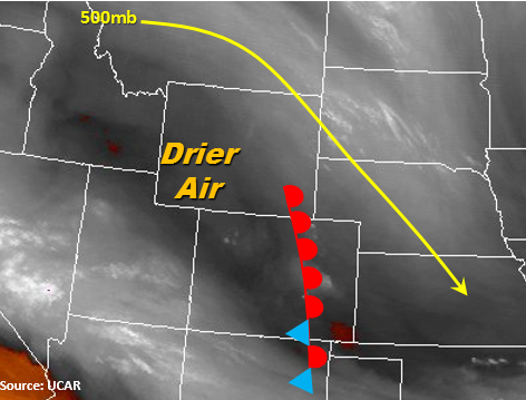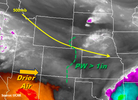 A moist low-level atmosphere and cooler temperatures are present throughout the state this morning. Cloud cover or fog are present over nearly the entire state with the exception of the SW corner where drier air can be seen on the water vapor imagery below. The overnight mesoscale convective system (MCS) is exiting the eastern plains over the KS/OK border this morning. Moisture rich air is beginning to regenerate showers over the Northeast Plains this morning with convective temperatures around 65F today. With moisture intact throughout the day and multiple shortwaves moving through the state, expect cloud cover and rain to continue throughout the morning and afternoon over the NE portion of the state. Once again, the 500mb ridge will continue to provide NW/W flow over the state and multiple mid-level waves for lift to generate storms throughout the day. We will continue to monitor the strength and efficiency of the waves throughout the day and likely provide a PM update.