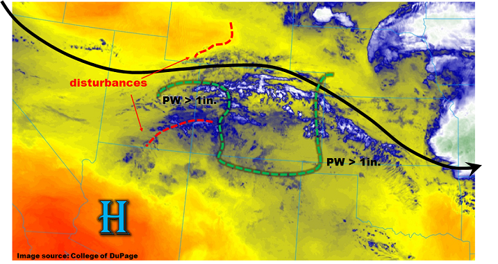 West of the Continental Divide, the embedded shortwaves in the westerly flow will also help trigger widespread storms in the moisture rich atmosphere. Westerly steering flows should confine the heavier rain producing storms to the higher terrains. Along the southern border, the drier air seen the water vapor imagery should limit rainfall totals. A shower or two in the Grand Valley cannot be ruled out as convection from the west moves into the state. The Flat Tops and Roan Plateau are particularly susceptible today to mud flows, debris slides and road flooding with storm totals as high as 2 inches.