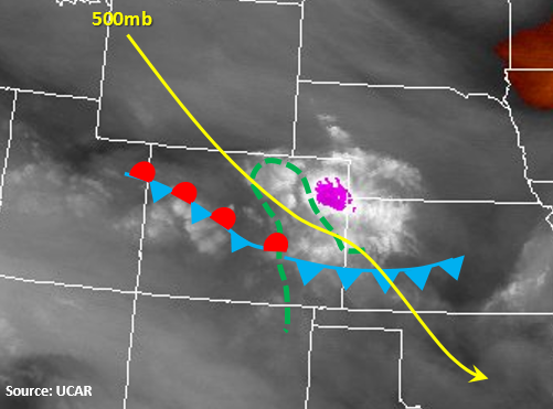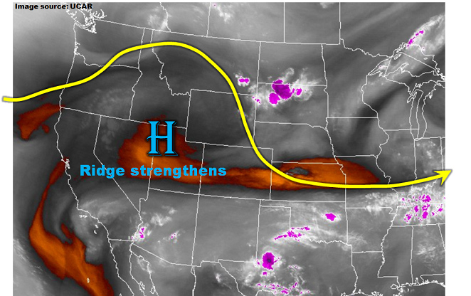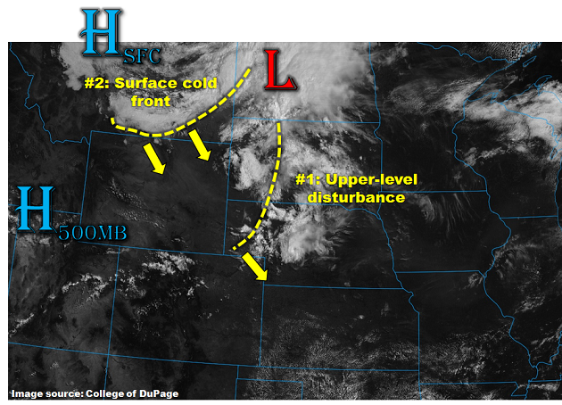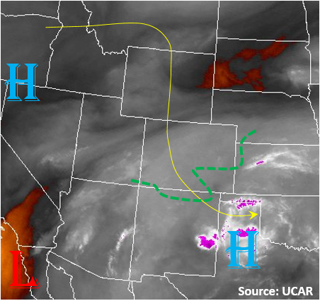 A strong summer cold front passed through the northern portion of the state last night bringing some isolated thunderstorms and much cooler temperatures for today. There are ongoing scattered showers over the eastern plains and central mountains this morning that can be seen in the water vapor imagery below. The showers are located near the cold front and upper-level disturbance, and will continue to move to the SE and exit the state by early afternoon. The cold front helped usher in some low and mid-level moisture east of the Continental Divide. The Precipitable Water (PW) over 1 inch for this afternoon is marked in the map below.