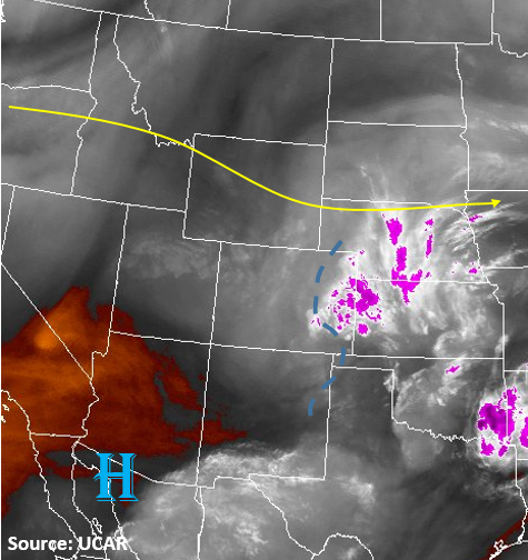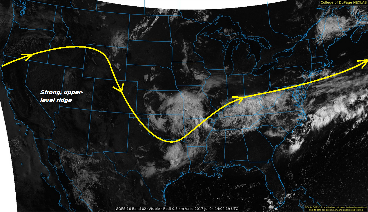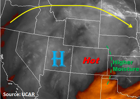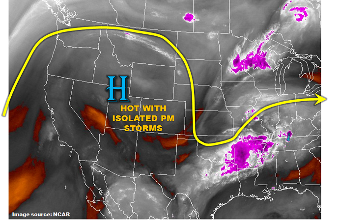 The upper level ridging pattern continues its hold over the western US again today leading to high surface temperatures. Temperatures at lower elevations could reach 100F with the higher terrain reaching 80-85F. As with the last couple of days, some moisture remains under the ridge. This will lead to some isolated thunderstorms over the high country again this afternoon. Over the Northeast Plains, there will be a minor disturbance this afternoon that will enhance upward motion. This could lead to scattered thunderstorms later this afternoon and evening. Since the moisture remains low, the main threat for all storms that form will be gusty winds, small hail and dry lightning. The storm motion will be slow today (5-10 knots), so there is a possibility for local minor street flooding or field ponding under storm cores. Flooding is not expected today.