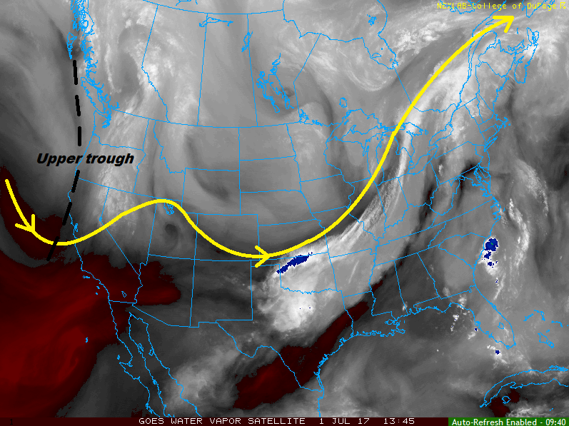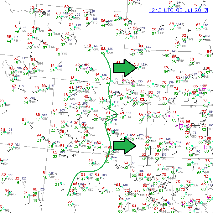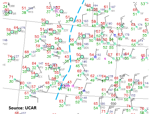 Today’s forecast features an uptick in showers/thunderstorms as a mid-level disturbance pushes across the region during the afternoon and evening hours. The increase in shower/thunderstorm coverage does not come with an increase in the flood threat, however, due to high temperature-dewpoint spreads in the low-levels and at the surface. I have annotated the current position of the 40°F dewpoint line on the surface observation map below. This line will shift east through the morning and into the afternoon hours as dry air aloft mixes down to the surface, pushing the best surface moisture over the far eastern plains. Even so, where the surface moisture hangs on, the high temperature will be in the low-to-mid 90’s, resulting in an “Inverted-V” atmospheric profile. The “Inverted-V” is indicative of efficient evaporation of falling precipitation, which will limit the rain rates at the surface.