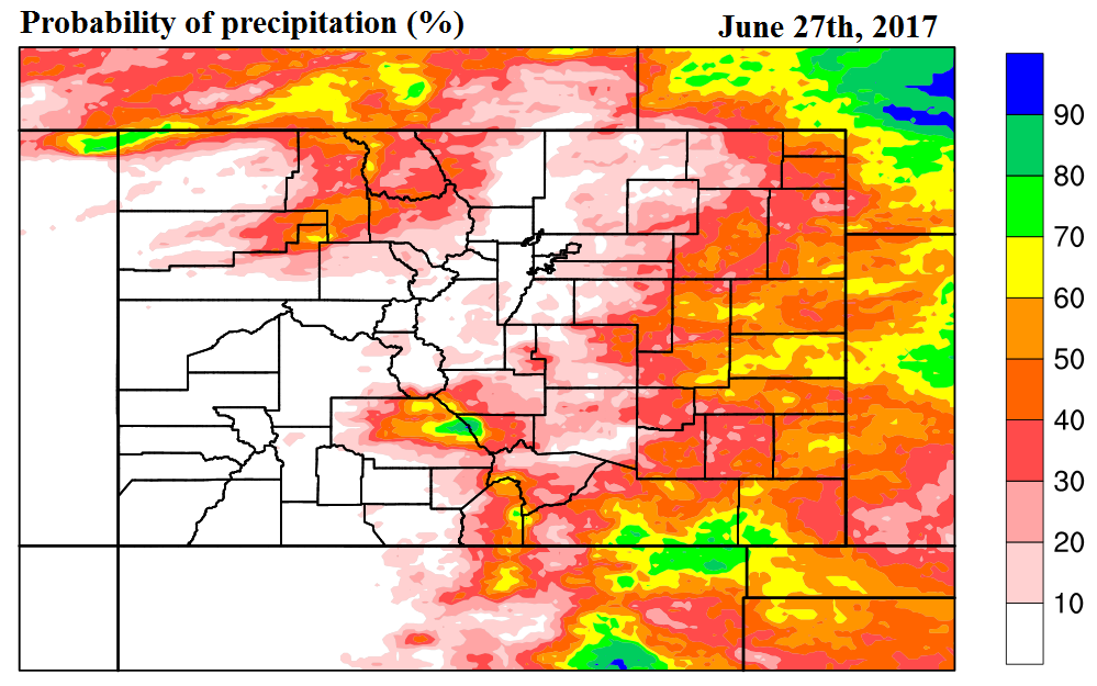 Mostly sunny and hot today. An isolated shower or weak thunderstorm cannot be ruled out over higher terrain near the WY border. Max 1-hour rainfall up to 0.2 inches. Gusty winds and dry lightning will be more of a threat than rainfall. An extreme fire danger exists today, with a Red Flag warning in effect for most of the area. Please stay tuned to local National Weather Service offices for updates.