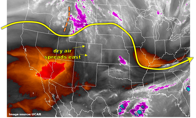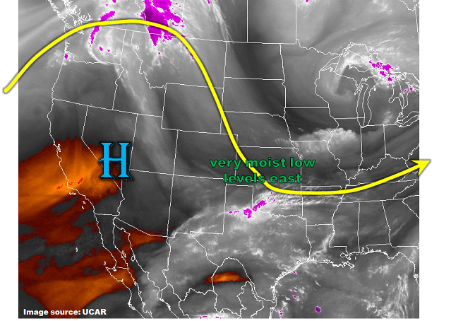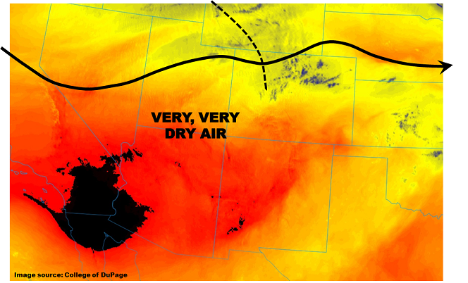 Perhaps the bigger story, however, will be the extreme fire danger in the western part of the state where low relative humidity (see water vapor image below), gusty winds and hot temperatures will create a dangerous situation for spreading fires. Hikers/campers – please be cautious.