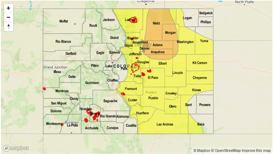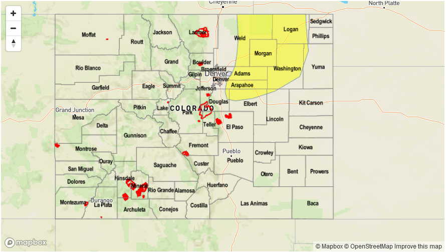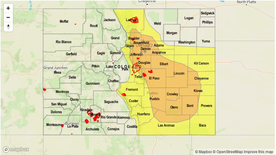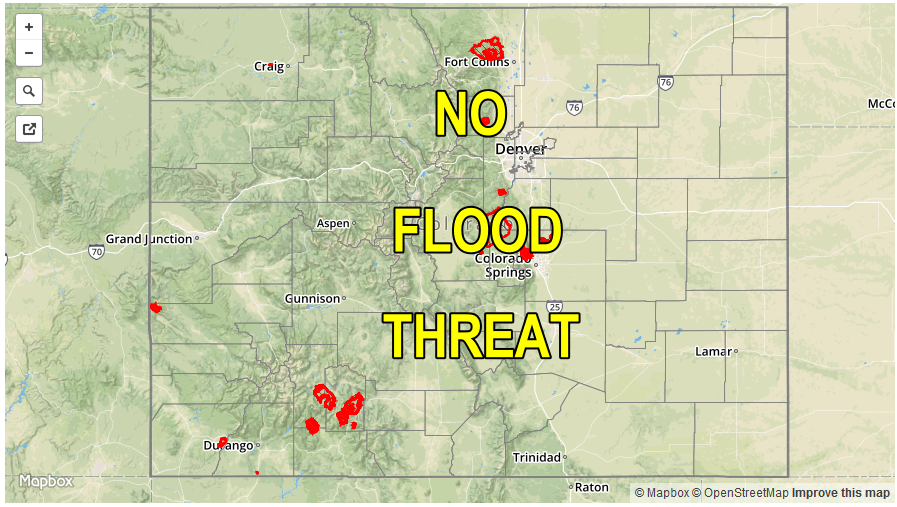 Mostly clear this morning then partly cloudy with isolated to scattered showers and thunderstorms by early afternoon. Storms will form over the higher terrain first, then move into lower elevations. Highest coverage will be in the foothills as well as farther east towards the KS/NE borders. Max 1-hour rainfall up to 0.8 inches towards the foothills, and up to 1.2 inches in the Northeast Plains and Southeast Plains. Hail up to 1.5 inches could accompany the strongest cells. Flooding is NOT expected today.