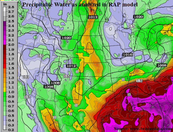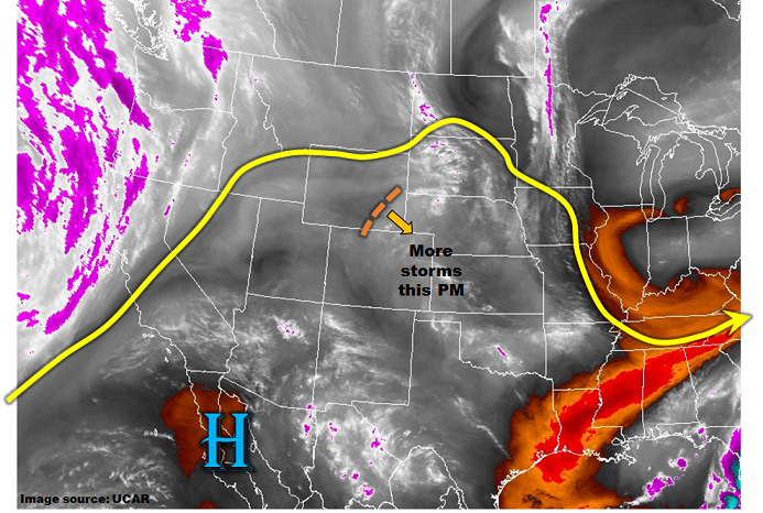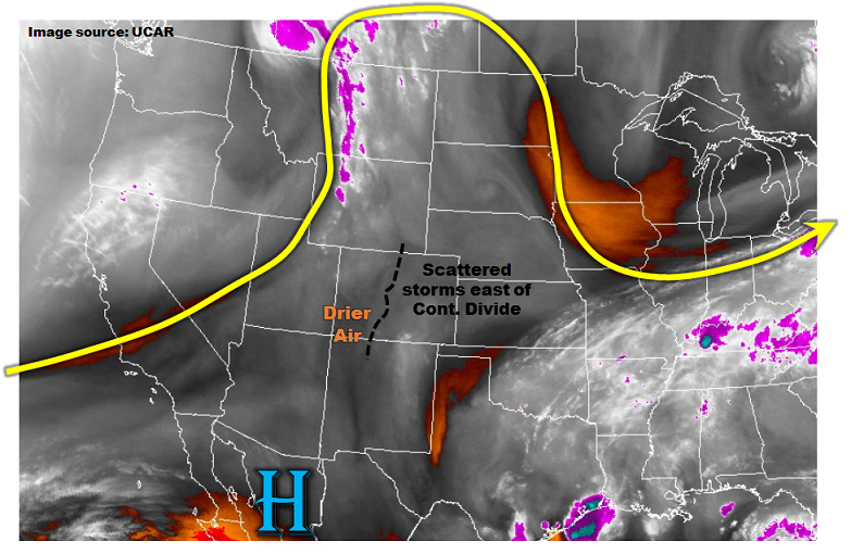 Much drier air is on its way into Colorado, as can be seen by the GOES-16 “Low-level water vapor” imagery shown below. While this morning’s Denver sounding still showed 0.71 inches of Precipitable Water, farther west Flagstaff had a reading of 0.14 inches and Salt Lake City with 0.20 inches. This air will make it to western Colorado by late afternoon, removing all chances for rainfall. Farther east on the other side of the Continental Divide, some drying will take place, but the diurnal lee-side trough will cause light easterly low-level flow that will continue to transport (or at least maintain) elevated moisture levels across the region. Thus, in the Northeast and Southeast Plains, isolated to scattered thunderstorms will be seen once again. However, with lower available moisture and faster steering winds, we expect localized pockets of heavy rainfall but without a flood threat.
