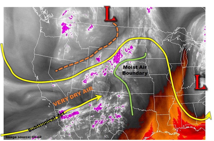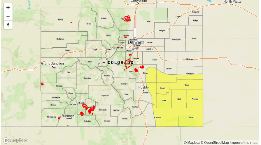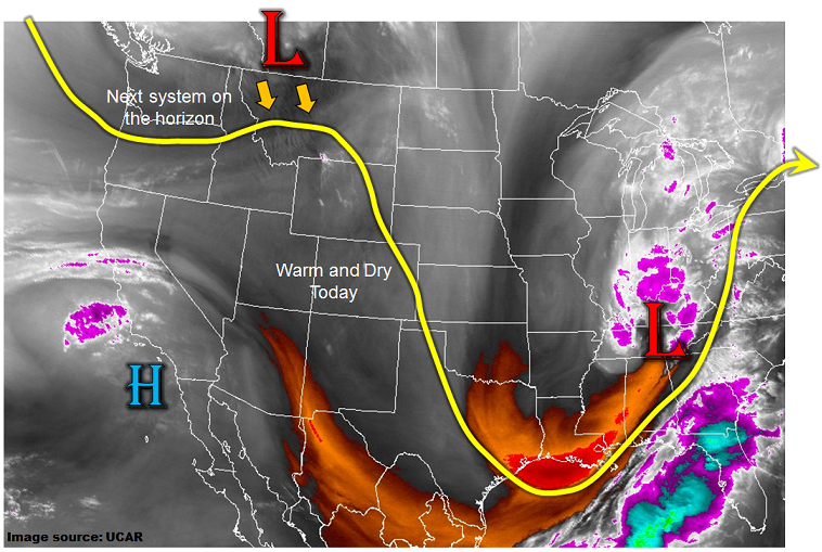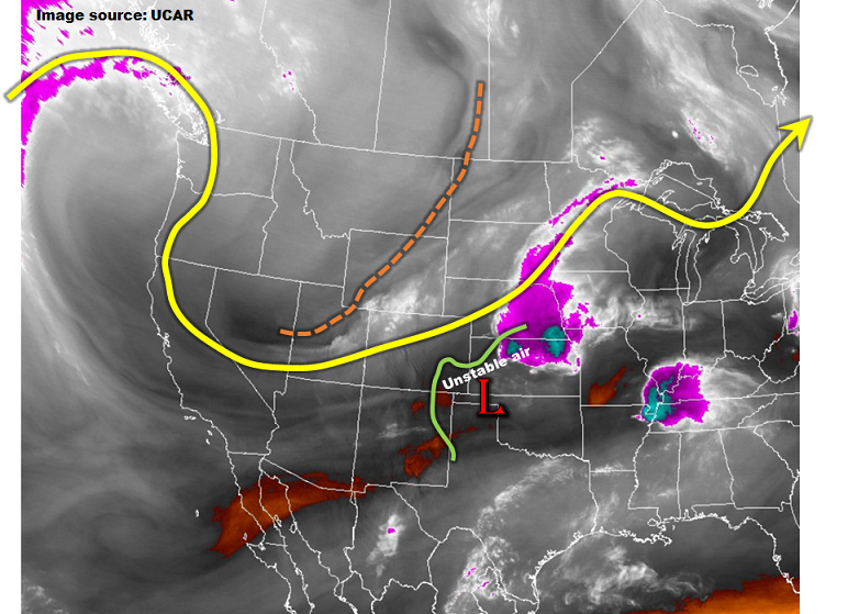 The main disturbance, responsible for the last two days’ worth of severe weather, will be traversing across Colorado today as seen in the water vapor image below. Upward motion will be favored to the east of the trough axis (tan dashed line) and some support will also be available from a weak jet streak moving out of Colorado this afternoon. Thus, scattered to numerous showers are likely to develop this afternoon, especially east of the Continental Divide. A lee-side surface low pressure trough will once again form today, this time along the NM/CO border. This will act to direct moisture northwest into the Southeast Plains and Raton Ridge area. Storm motions in that region will be on the slower side, in the 25-30 mph range, which is conducive for locally heavy rain. The main factor acting against the chances of heavy rainfall will be limited instability, except for the southeast portion of our state. There, up to 1,000 J/kg of CAPE will be briefly available for convective development, with surface dew point temperatures in the low 50s feeding thunderstorm inflows. All in all, expect isolated to scattered thunderstorms in southeast Colorado today with at least isolated heavy rainfall being a good probability. Thus, a Low flood threat is warranted for that area.