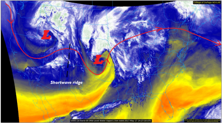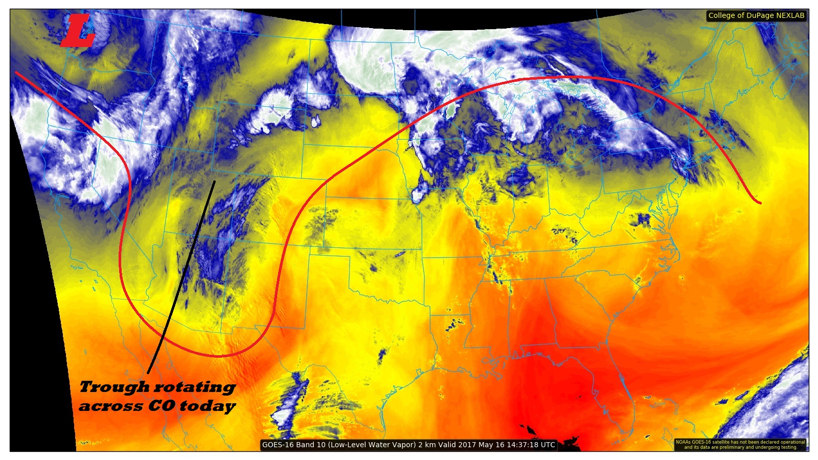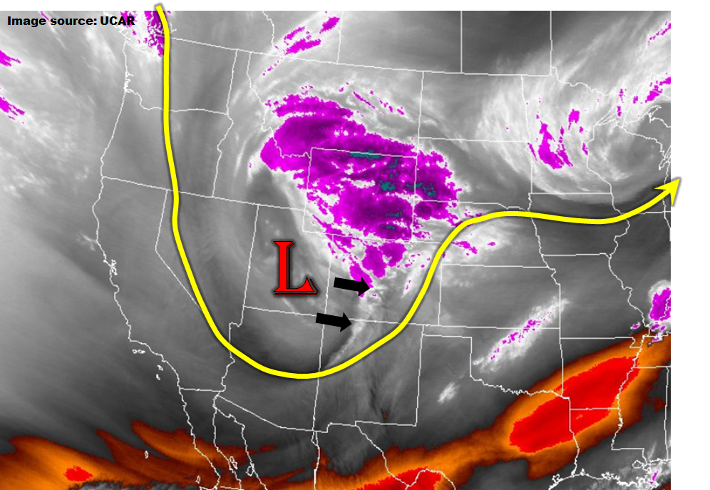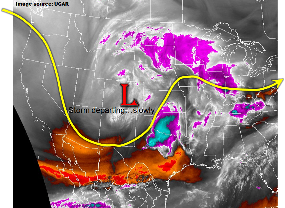 The impressive late season snowstorm that affected our entire state on Thursday will weaken and continue to trek eastward today. The water vapor image below shows that it is positioned across eastern Colorado as of this morning; by this evening, it will move into western Kansas. Most of eastern Colorado will continue to be under its influence today with numerous showers and perhaps a weak thunderstorm likely. However, with little to no instability and weaker dynamics, precipitation intensities will be lower than yesterday. Nonetheless, a few places along the Kansas and Nebraska borders may pick up over 1 inch of rainfall but distributed over many hours. Thus, we do not expect a flash flooding threat today.