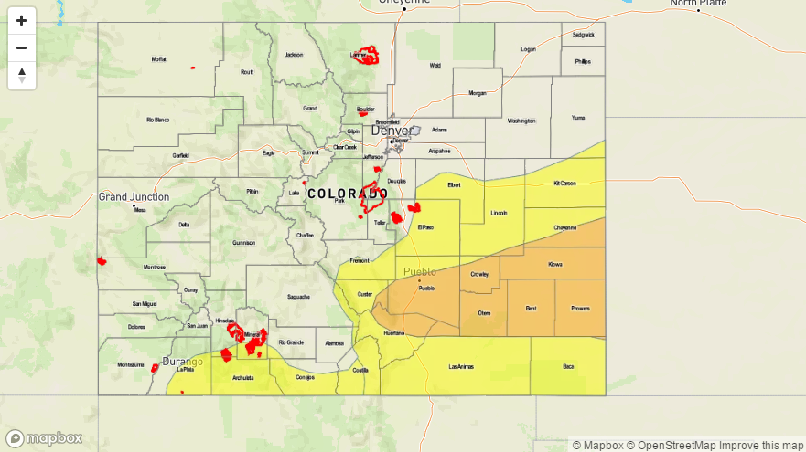 The upper-level low that has brought about an extended wet period to Colorado will finally exit to the east today. The corresponding surface low (denoted in the visible satellite image below) is already centered over western OK, with wrap-around precipitation remaining only over southeastern Colorado. The extensive cloud shield associated with this low will exit as the morning turns to afternoon, leaving behind mostly sunny skies for much of the state by this evening. The showers currently ongoing across southeastern Colorado are light, and are not expected to produce any additional flooding issues. Ongoing flooding issues across portions of the Southeast Plains will continue through the period, and are outlined on the flood threat map below.
