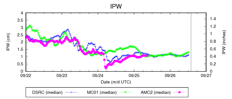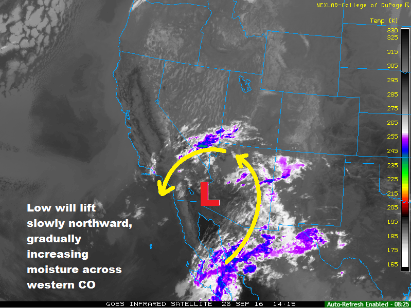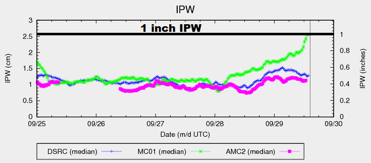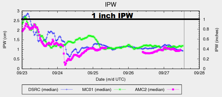 Stuck between an upper-level ridge over the central US and an upper-level trough off the West Coast, the flow across Colorado will be southerly today/tonight. This will continue to bring in subtropical moisture (associated with the weakening upper-level low) to western Colorado, while drier air remains in place for areas east of the mountains. This stark contrast between the two regions is illustrated well by the IPW graph below, showing the dramatic increase in moisture over Grand Junction (green line), while measurements from Boulder (blue line) and Schriever AFB (pink line) have remained fairly steady for the past few days.