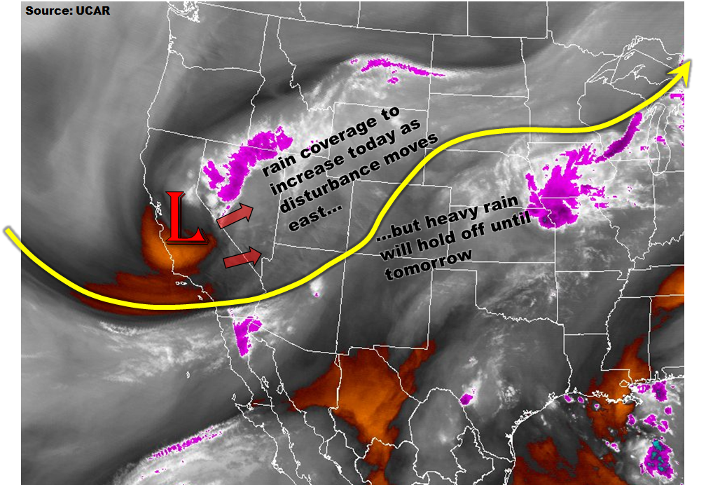 The broad, upper-level trough is easily seen centered over central California on this morning’s water vapor image (below). This cut-off disturbance will maintain its intensity and slowly approach Colorado today. Low-level moisture has recovered over the past 24 hours so that morning precipitable water (PW) values are in the 0.6 to 0.9 inch range across the state. A thin low-cloud deck is noted this morning east of the Continental Divide, which will likely limit surface heating and instability away from the foothills. Sunshine over the western part of the state will provide instability for scattered showers and weak thunderstorms today. Farther east, the highest instability and dynamics are expected to be juxtaposed over the foothills along the entire I-25 corridor. However, moisture will be marginal and upslope flow will be limited to the lowest 3,000 feet. Although scattered thunderstorms are expected, especially over the Palmer Ridge, maximum rain rates are expected to stay just below flood threat levels. Thus, flooding is not expected today. Expect heavy rainfall rates tomorrow as the disturbance moves closer to Colorado.