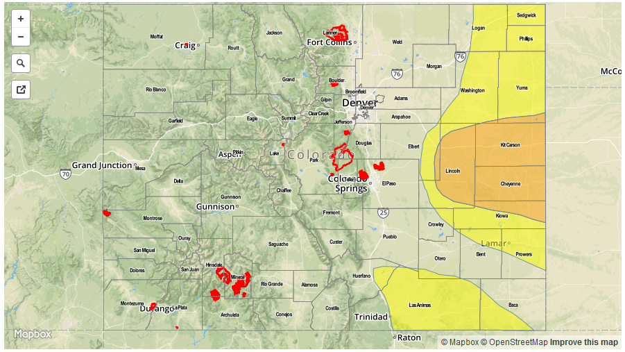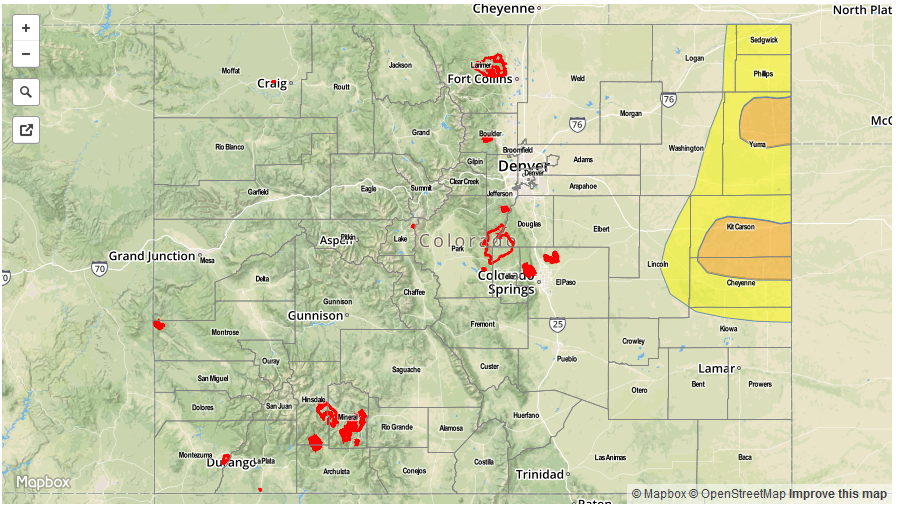 Another threat today is the developing high fire danger across high valleys in the Northern Mountains and Front Range regions, across the Palmer Ridge, and for the lower valleys of far western Colorado. Relative humidity values will drop to near (or just below) critical values, and combined with the gusty winds, will bring the fire threat back into the discussion. A mitigating factor, so to speak, is recent days’ rainfall keeping most fuels above critically dry designation. However, locations that have not received much rain lately will have the driest fuels, and extreme caution needs to be exercised. For more information, including the exact location of Red Flag Warnings, please visit the website of your local National Weather Service office.
