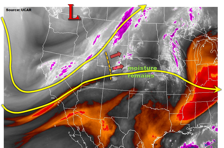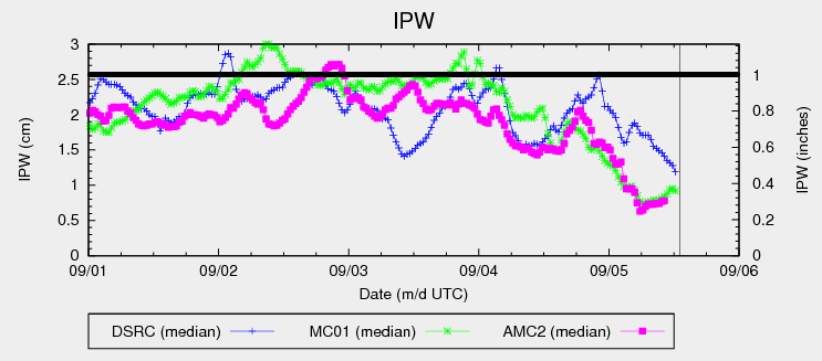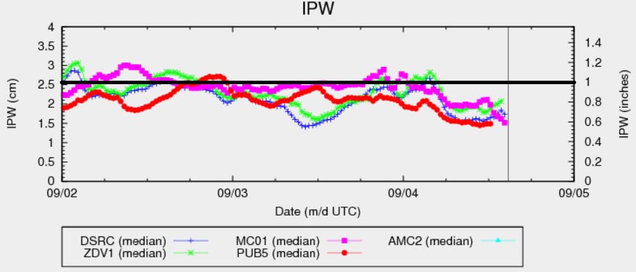 Moisture has taken a significant dip since yesterday afternoon as dry southwest flow aloft has overspread Colorado. This drier air is very apparent in the IPW chart below, showing values steeply declining for the last 12 hours or so. This drier air will result in much of the state experiencing a mostly sunny (and dry) Labor Day holiday. The exception to this rule will be across far southern and southeastern Colorado, along and east of a developing dryline. Weak support aloft will help kick off isolated thunderstorms in this area, with the main threats being strong winds and hail. Moisture values are too low to warrant any flood threat considerations.