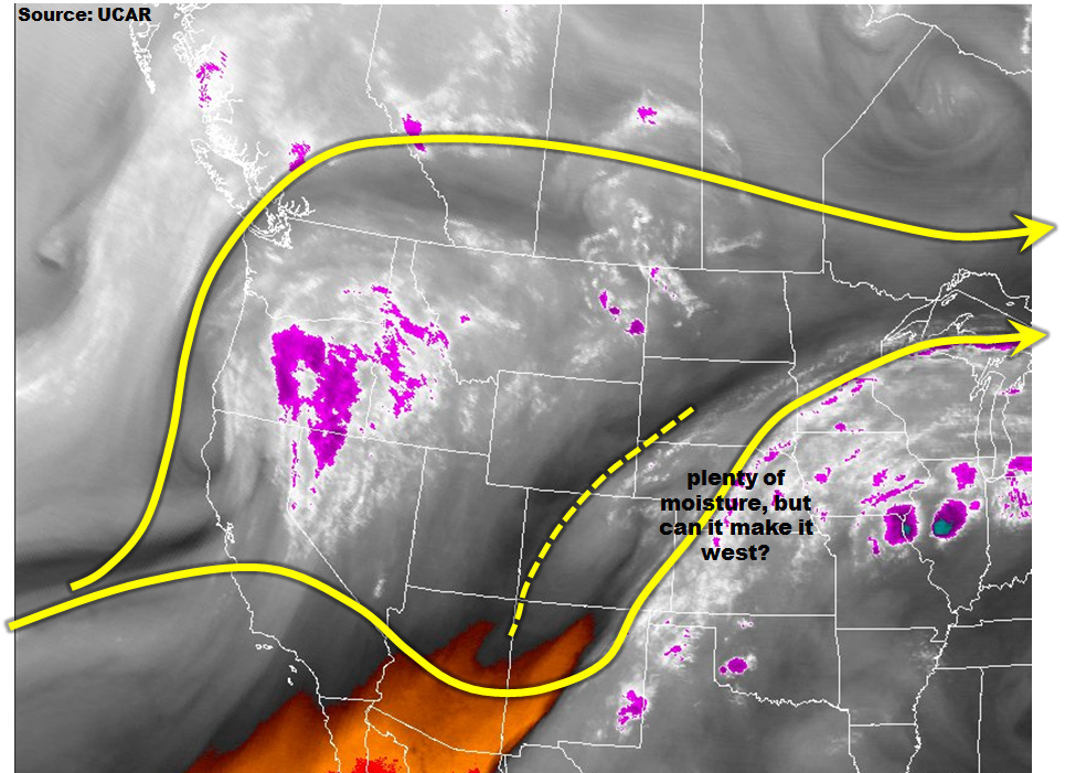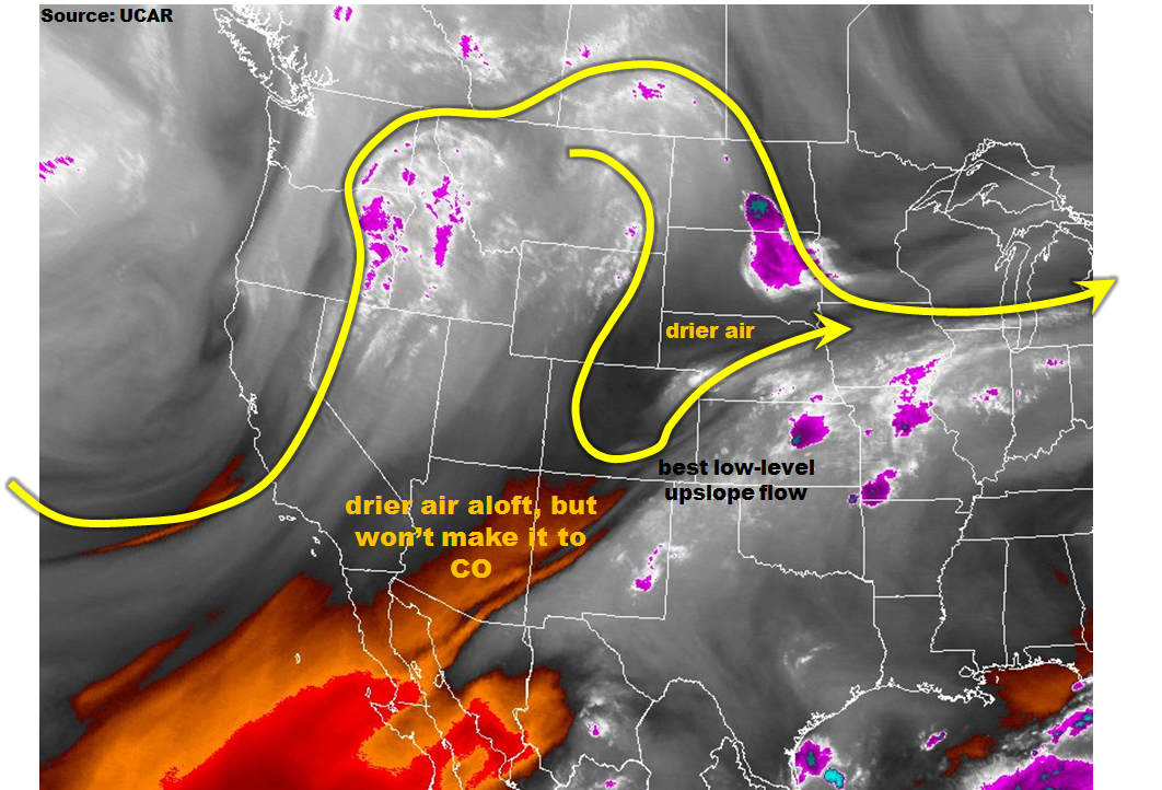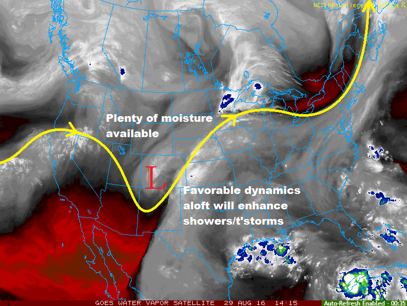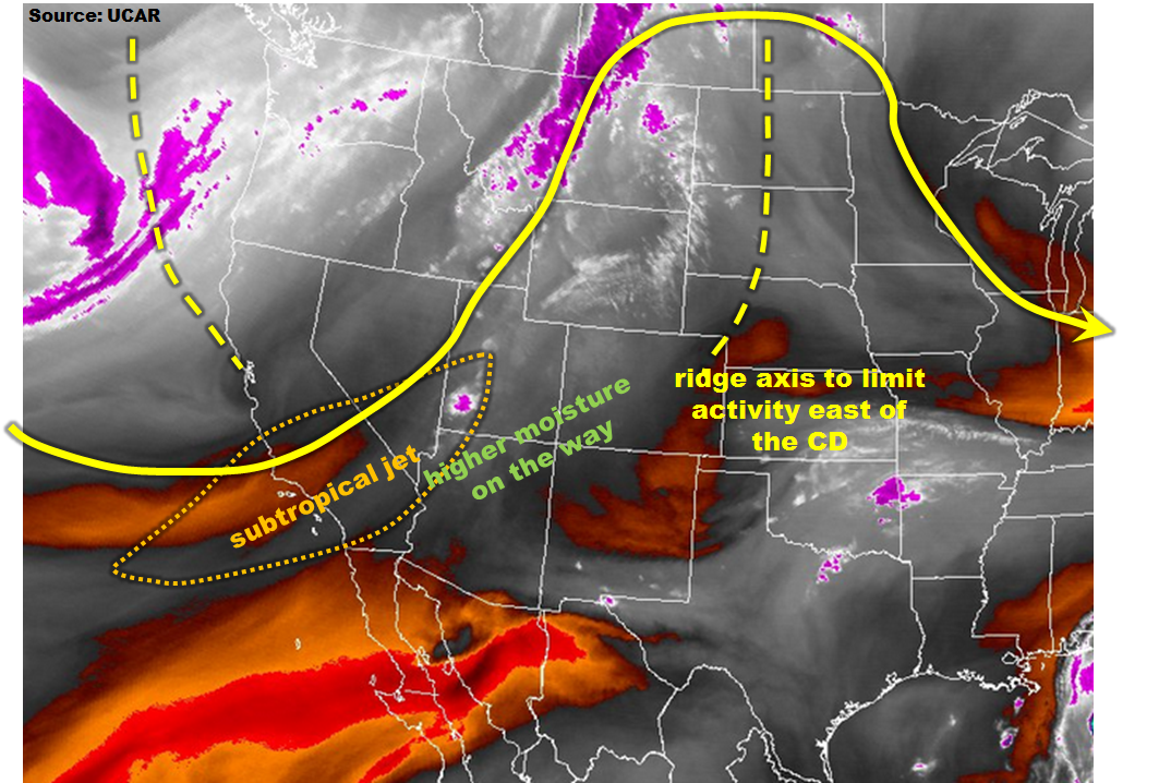 Major changes are on the way for Colorado’s weather, as can be seen by the water vapor image, below. A large-scale trough is entering the western coast of North America. This feature is also being supported by a strong subtropical jet streak centered over southern CA, NV and UT. This jet will slowly approach Colorado, and provide favorable outflow winds for any thunderstorm activity that develops. An associated surface low pressure system, centered over the northern Great Basin, will begin to transport higher moisture content west of the Divide. Thus, thunderstorm activity will increase today along the western slope, most notably over the climatologically favored San Juans. Farther east, a decaying disturbance has allowed a ridge axis to stretch into northeast CO from the northeast. This will provide light subsidence in the mid-levels and be generally unfavorable for storm activity. However, with the high residual moisture content in place (dewpoints > 55F, precipitable water 0.8 – 1.2 inches), a rogue storm cannot be ruled out. Today, we have a Low flood threat out for the southern parts of the state where dynamics and moisture will be juxtaposed best for thunderstorm formation.