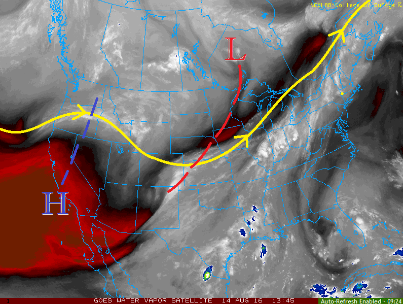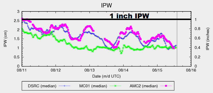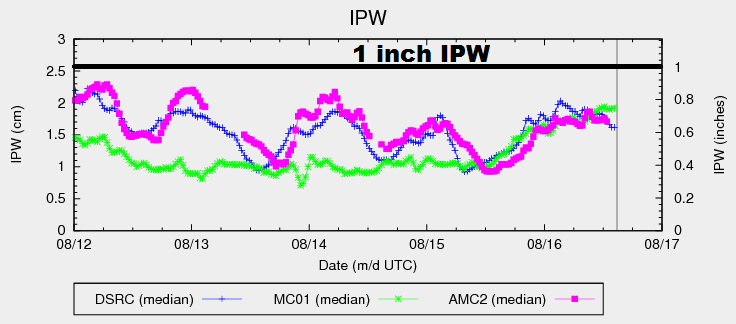 Precipitable water increased steadily throughout the afternoon/evening yesterday before leveling off overnight, as shown in the graph below. Another bump from current readings is expected today, pushing IPW values to 0.8-0.9 inches at the 3 reporting locations below (Grand Junction, Boulder, and Schriever AFB). A little better moisture will exist further east over the plains, thanks to better surface moisture values with dewpoints in the 40s/low 50s. Aloft, the important feature will be a weak mid-level disturbance that is expected to rotate across the state this afternoon and evening.