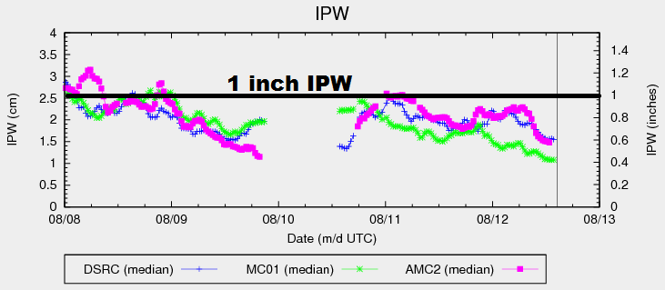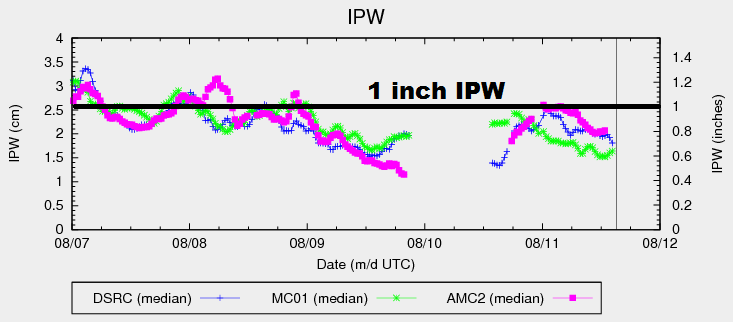 The Continental Divide defines a clear line in the sand for today’s forecast, so to speak. For areas west of the Divide, mostly sunny skies and dry conditions will rule the forecast, with only an isolated brief shower or two possible over the higher terrain near the Continental Divide. Moisture, as evident in the IPW graph below, is lower over western Colorado, with Grand Junction measuring about 0.4 inches IPW this morning. Afternoon high temperatures will be a few degrees cooler than yesterday behind the weak cool front that passed through overnight.