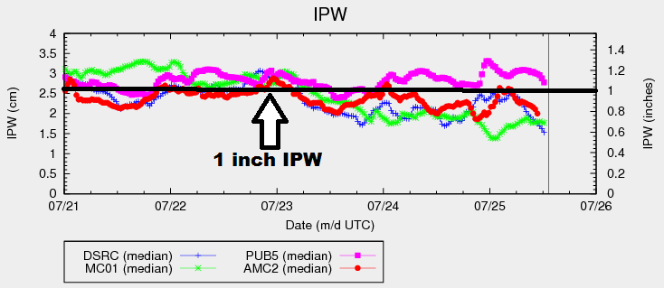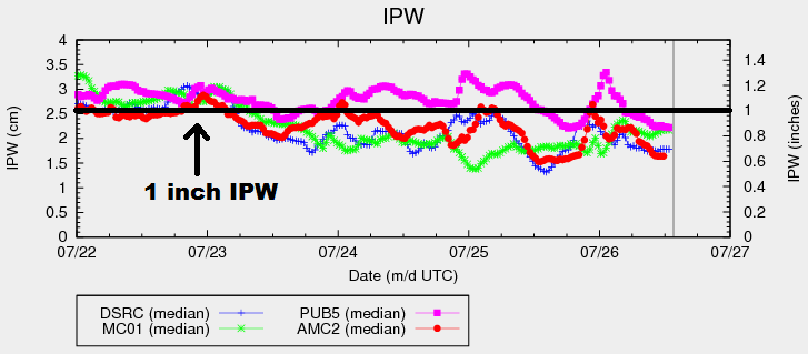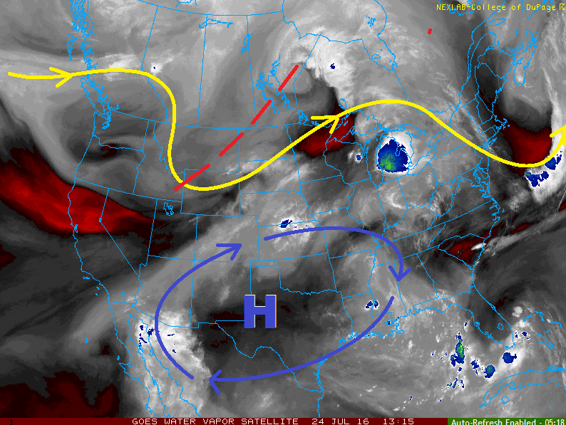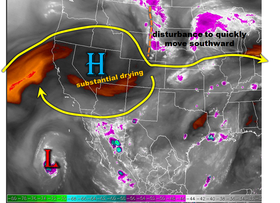An interesting weather pattern is noted this morning across the Rocky Mountain states, as shown by the water vapor image below. The first feature of interest is the high pressure that has developed over the Great Basin. This will quickly strengthen today, and its clockwise circulation will basically shut off the northward transport of new moisture from the south (including the outflow from Tropical Storm Frank). The result will be much lower rain coverage and intensity west of the Divide. The second important feature is a rather strong disturbance, especially by summer standards, that is currently located over Wyoming and Montana. This will race south-southeastward and clip eastern areas of our state, providing favorable dynamics for enhanced upward motion. Scattered thunderstorms will be likely for far eastern areas. Counteracting this will be the rapid drying as downslope winds usher in much lower dewpoints originating off the Cheyenne ridge and then spreading south and east. The disturbance will also promote fast storm motion, up to 40 mph, which will be a negative factor for heavy rainfall in a given location.