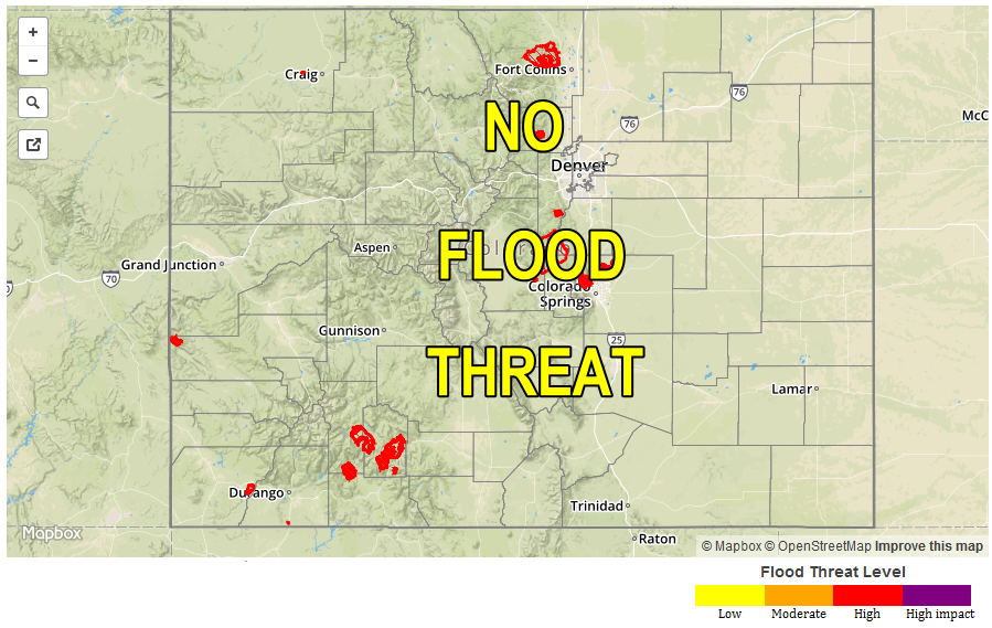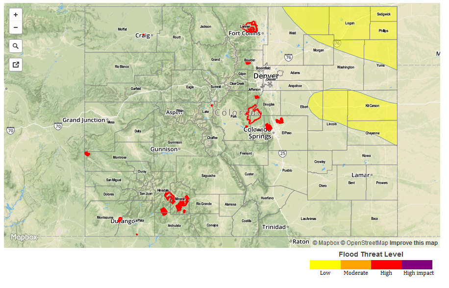 A LOW FLOOD THREAT IS FORECAST FOR SURROUNDING AREAS, INCLUDING PORTIONS OF THE NORTHERN MOUNTAINS, GRAND VALLEY, NORTHWEST SLOPE, FRONT RANGE, URBAN CORRIDOR, AND NORTHEAST PLAINS.