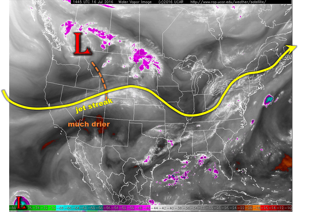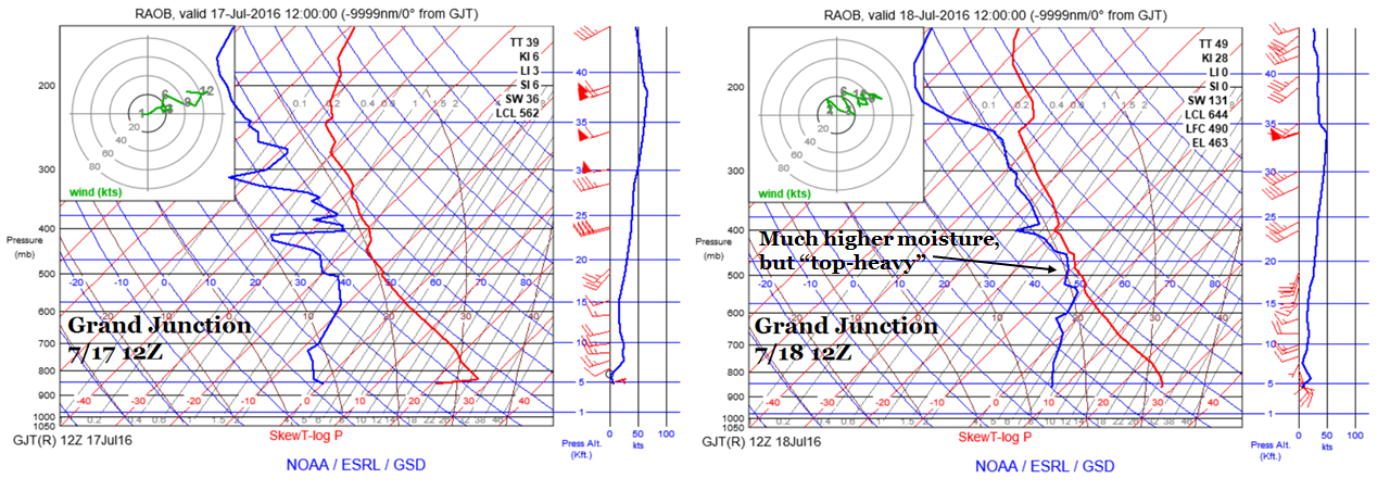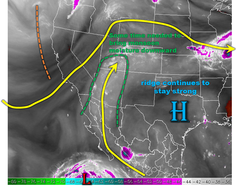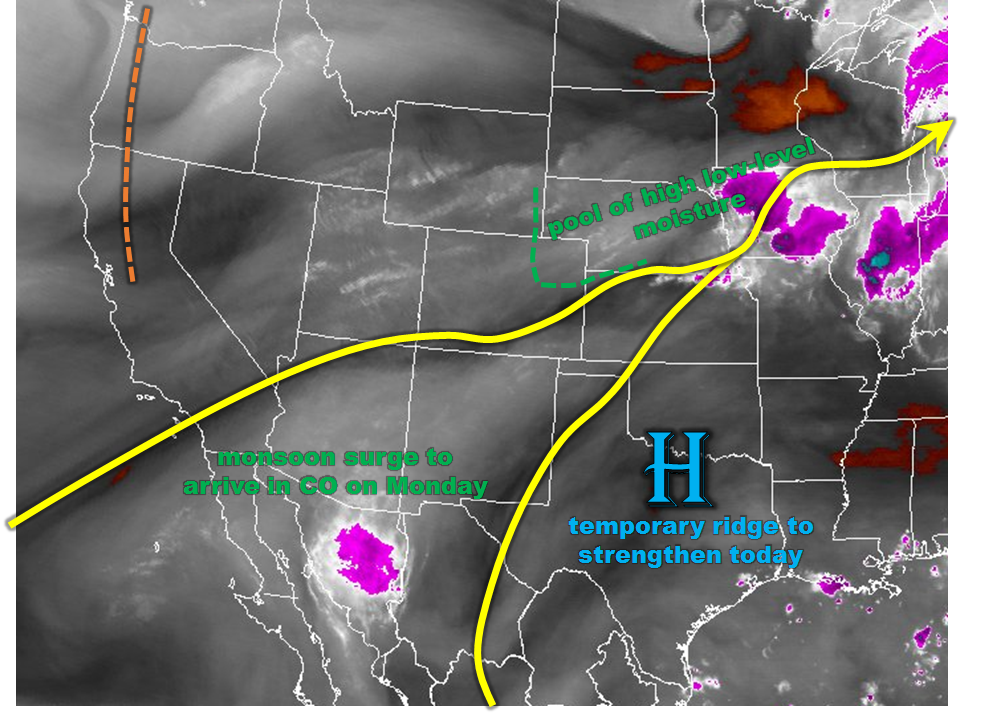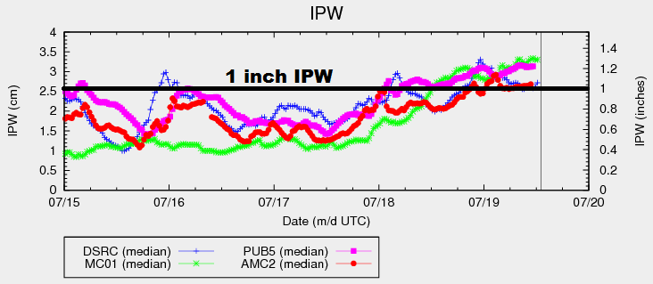 Current water vapor analysis shows a strong, upper-level high centered over the south-central US and an upper-level low spinning just off the coast of the Pacific Northwest. These two features have created a pathway for monsoonal moisture to flow into Colorado, pushing IPW values above 1 inch at all four of the normal reporting stations (Grand Junction, Boulder, Pueblo, and Schriever AFB, shown below). This amount of moisture will create an environment in which heavy rain is possible, thus the issuance of the flood threats today.