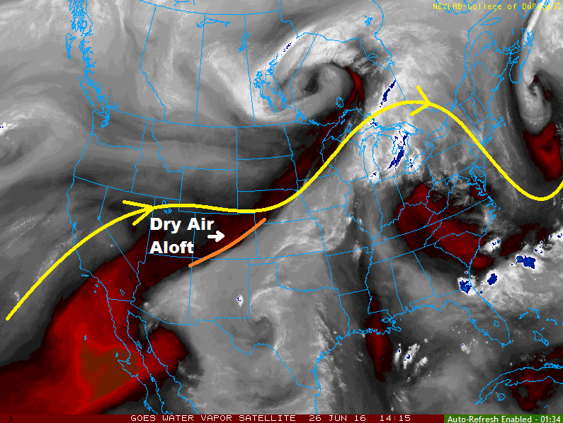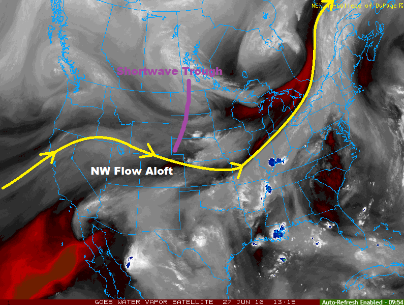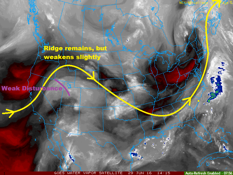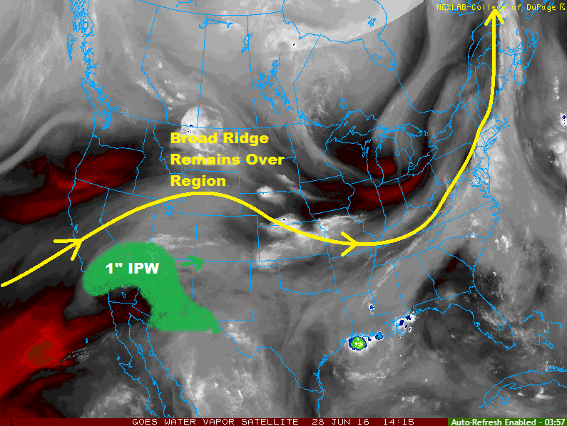 Current water vapor analysis shows the (slightly weakening) mid-/upper-level ridge still in place across the region today. Underneath the ridge, sufficient mid-level moisture remains across the state, while monsoonal moisture continues to seep into Colorado from the west/southwest. Embedded within the flow is a weak disturbance that will pivot out of Utah this morning and into Colorado this afternoon/evening. The disturbance will provide the support for more widespread showers/thunderstorms today across the High Country, as well as another day of scattered thunderstorms across eastern Colorado.