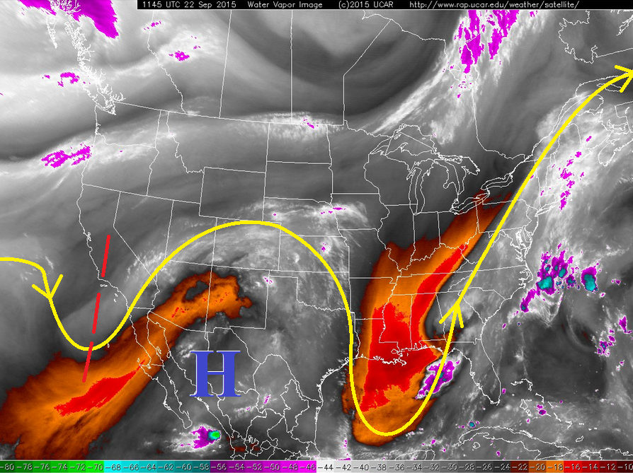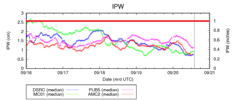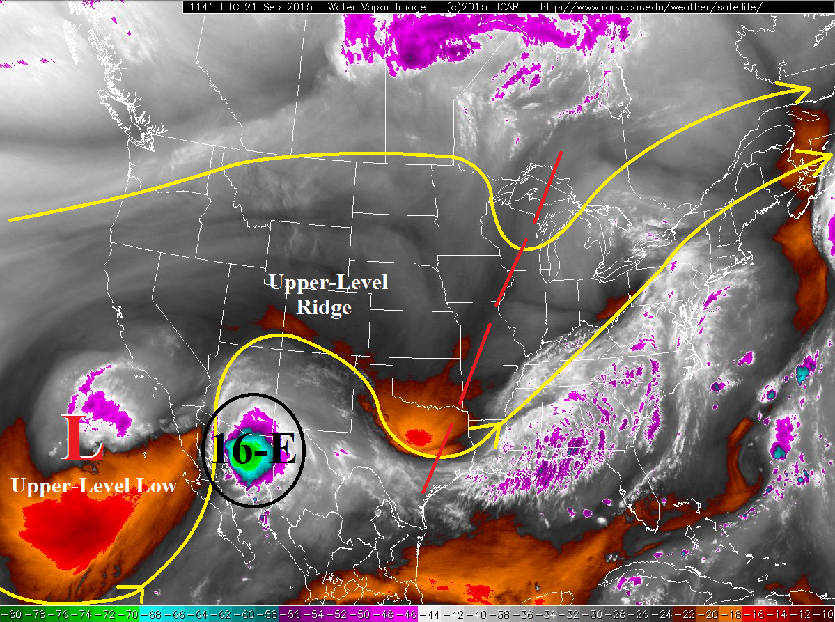 The moisture remnants of Tropical Depression Sixteen-E are easily spotted across Colorado this morning, with the bright white colors indicating ample mid- and upper-level moisture. This increase in moisture has been accompanied by an increase in cloud cover, and all of these ingredients will have an impact on today’s forecast. First of all, the increase in cloud cover will lead to high temperatures that are cooler than the past few days, giving the air a more autumn-like feel. Second, the increase in moisture will lead to an increase in showers/thunderstorms today, and a few will produce heavy rain. To break down where this is likely to occur, we need to look at the lower levels of the atmosphere.