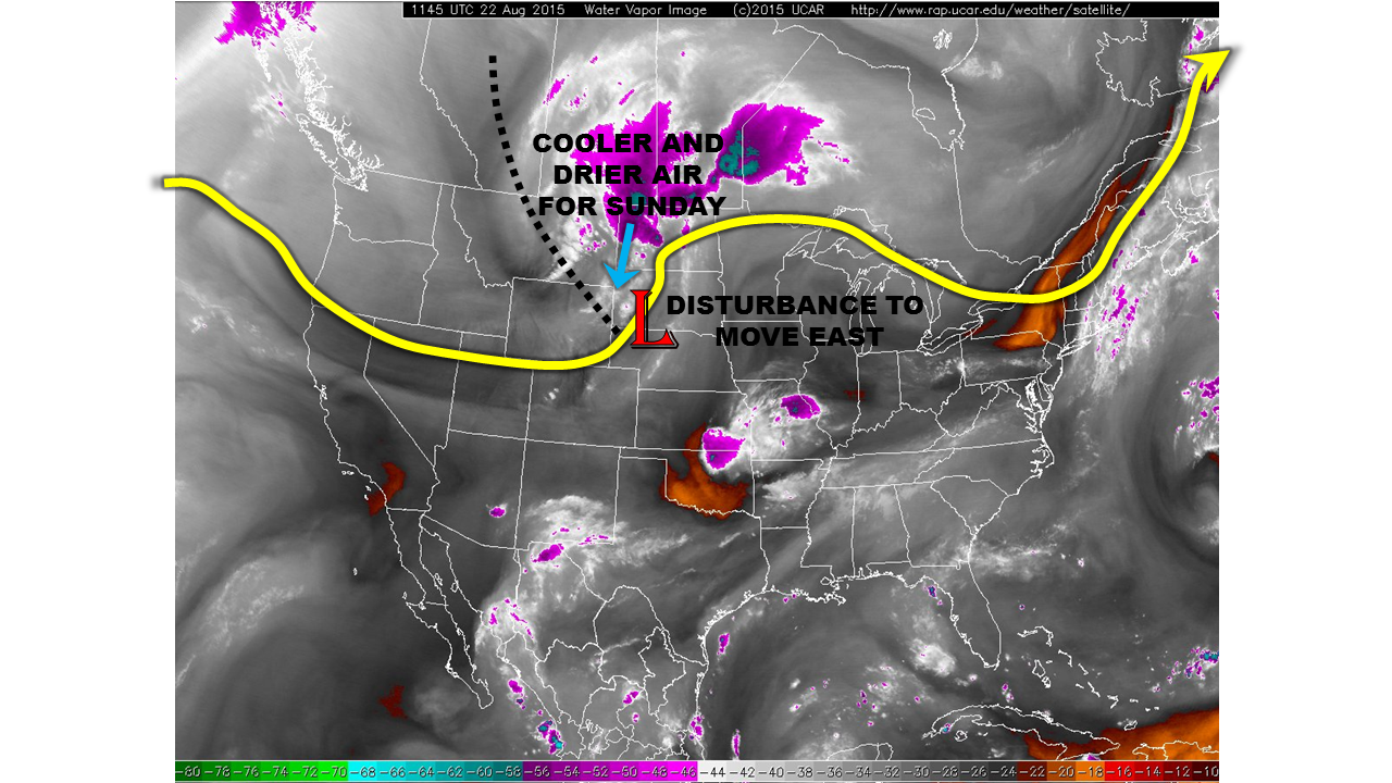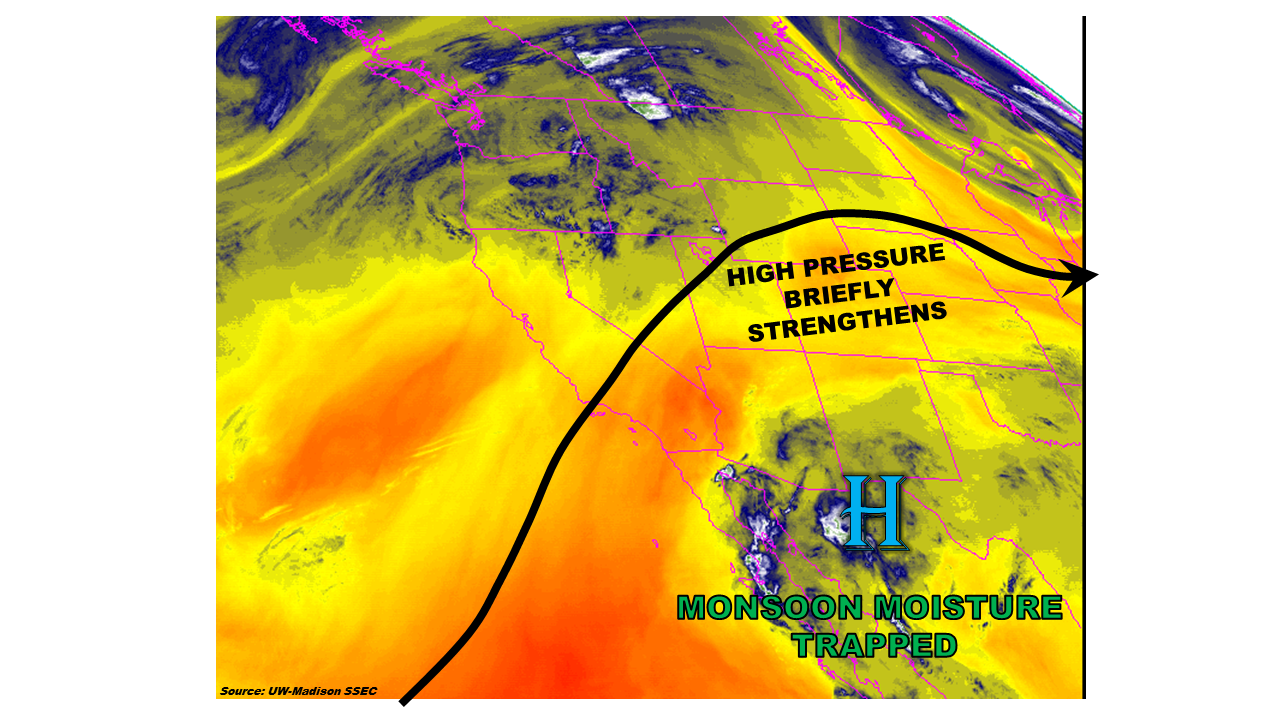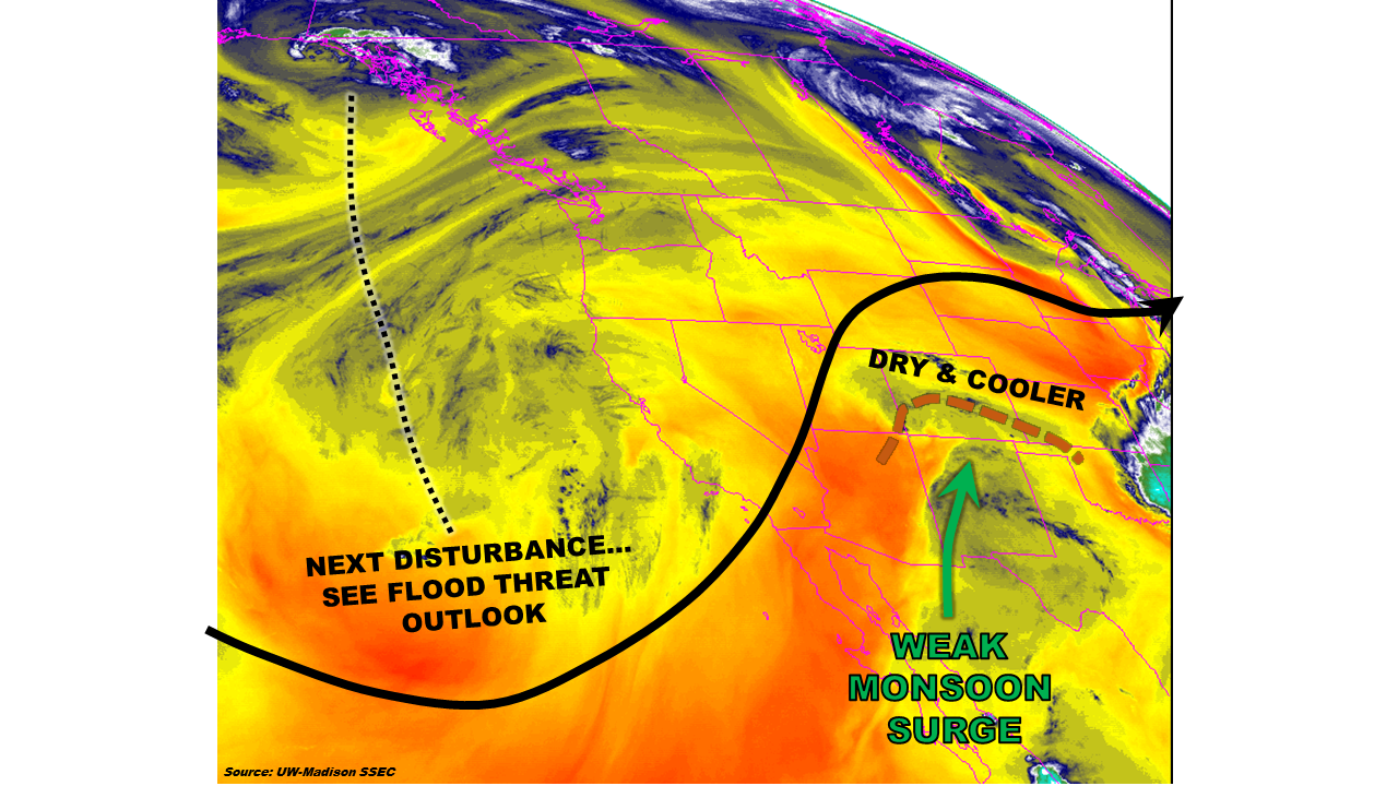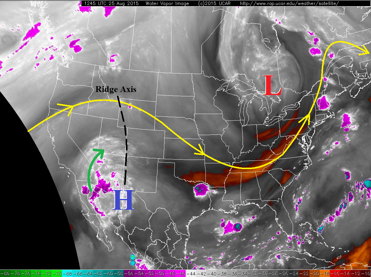 Subtle changes to the environment compared to yesterday will bring slight changes to the forecast, but no flood threat will unfold. The mid-/upper-level ridge axis, depicted on the water vapor imagery below, will shift slightly eastward, allowing a bit more moisture to make its way into Colorado this afternoon and evening. The moisture will bring a slight uptick in thunderstorm activity over/near the mountains, including the Urban Corridor and Palmer Ridge regions. The Northeast and Southeast Plains will hold a low possibility for isolated thunderstorms, with chances diminishing from west to east.