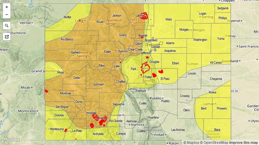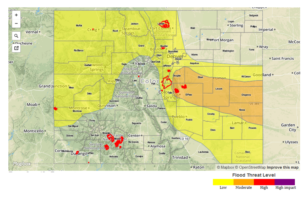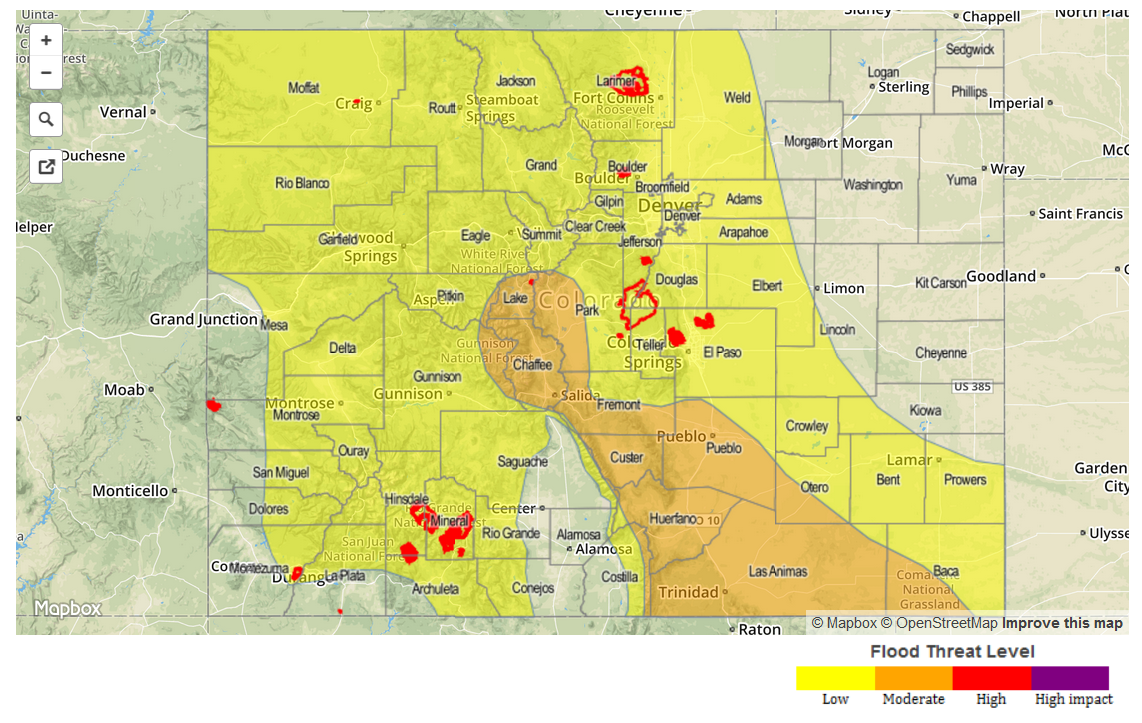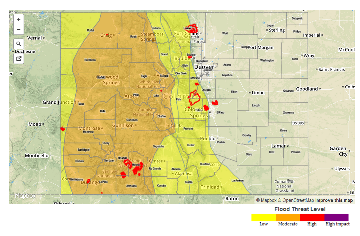 — Low flood threat for Grand Valley, Northwest Slope, Northern Mountains, Front Range, Urban Corridor and parts of Northeast Plains