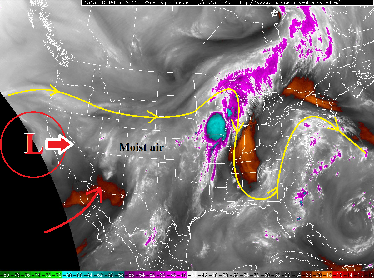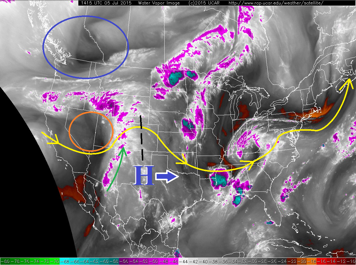 A disturbance will trek across Colorado today, sparking more thunderstorm activity. This disturbance is a “child” of the parent low-pressure system that continues to rotate off the California coast, as shown by the water vapor imagery below. Another disturbance is noted on the UT/NV border that may influence northwestern Colorado later this afternoon. With the favorable dynamics described above, we now look at today’s moisture content. As in past days, it is quite high with dewpoint temperatures in the 40s and 50s across the state. Precipitable water values remain at or above an inch almost statewide, further supporting the heavy rain threat.
