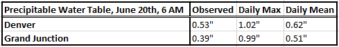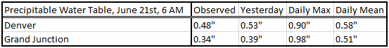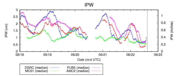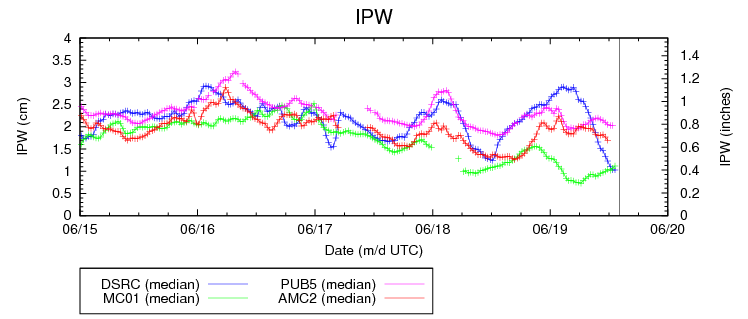 You will notice that today’s forecast mirrors much of the last few days’, with abundant sunshine and dry conditions in the forecast. Moisture has continued the overall downward trend over the last few days, easily seen in the IPW chart below. As of 8 AM, all four of the normal reporting stations – Boulder (blue), Grand Junction (green), Pueblo (pink), Shriever AFB (red) – were below 0.4 inches IPW. A cool front is currently cutting through eastern Colorado, reinforcing some moisture and bringing gusty, northerly winds. The main result from the front today will be slightly cooler high temperatures for the Urban Corridor, Northeast Plains, Palmer Ridge, and Southeast Plains regions. Over the mountains, temperatures will be nearly the same as yesterday, with the lowest valleys flirting with, and a few surpassing, 100 F for afternoon highs.