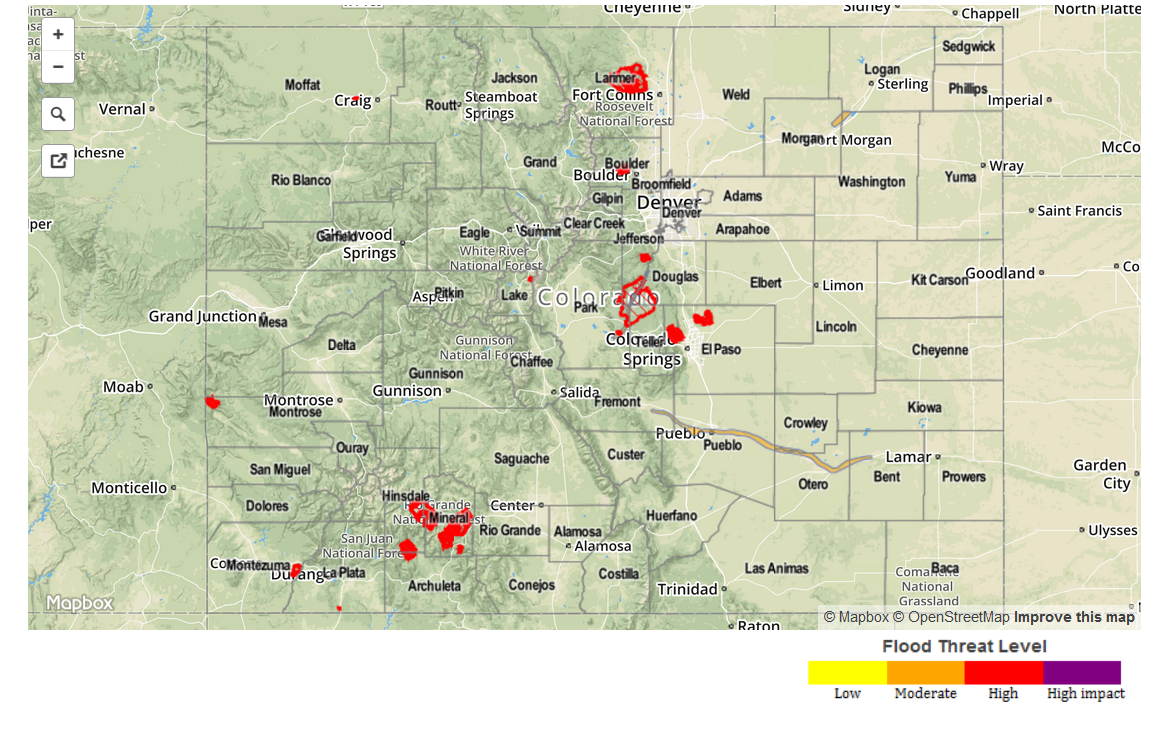 A MODERATE FLOOD THREAT CONTINUES FOR THE LEVEE BREACH ALONG THE SOUTH PLATTE RIVER IN MORGAN AND WASHINGTON COUNTIES, AS WELL AS ALONG THE SOUTH PLATTE RIVER ACROSS PORTIONS OF PARK, DOUGLAS, AND JEFFERSON COUNTIES. A MODERATE FLOOD THREAT IS IN PLACE FOR PORTIONS OF THE ARKANSAS RIVER AS SNOWMELT AND RESERVOIR RELEASES WILL KEEP RIVER LEVELS HIGH.