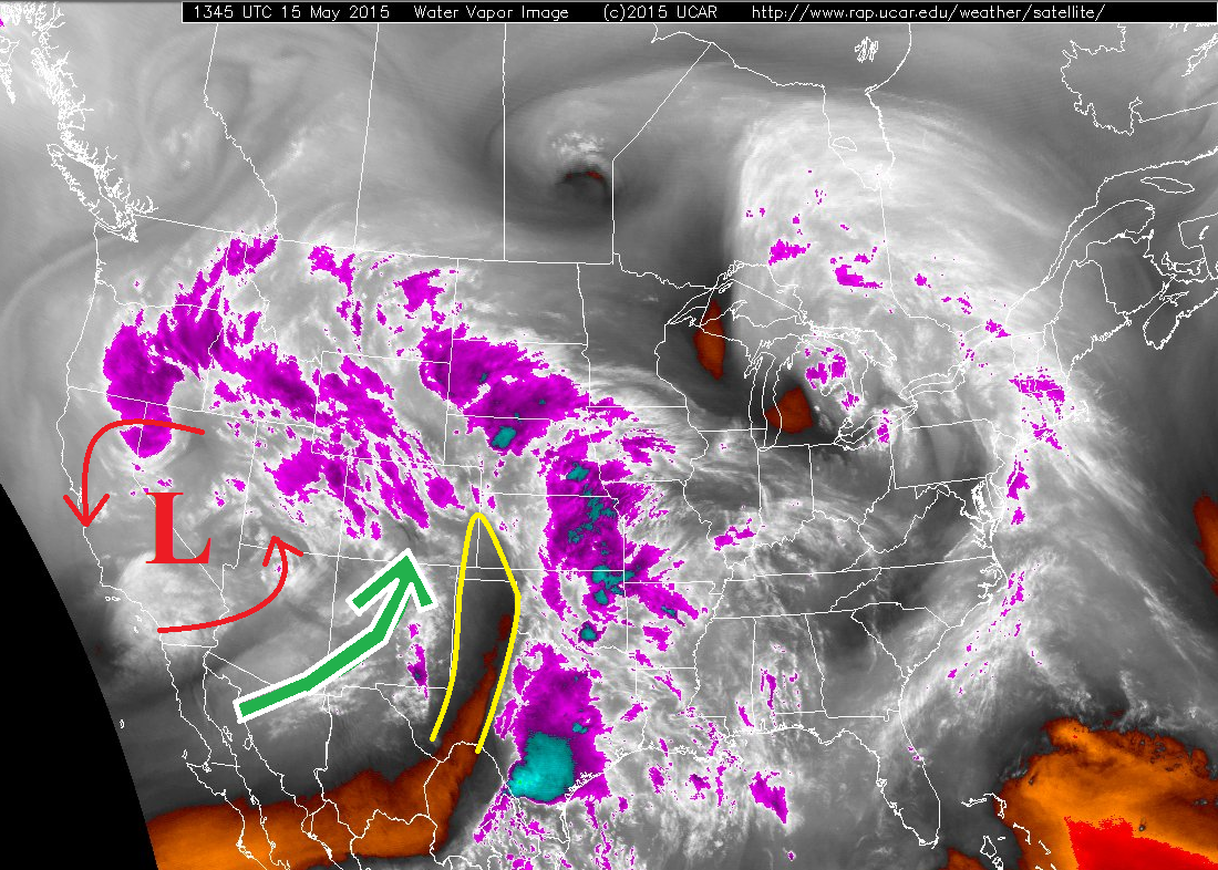 The upper-level low/digging trough that was mentioned in yesterday’s FTB is still hanging around near the West coast, but today it is on the move. It will slowly slide to the east-northeast, becoming centered over Utah by tomorrow morning. As it does this, a few things will happen…