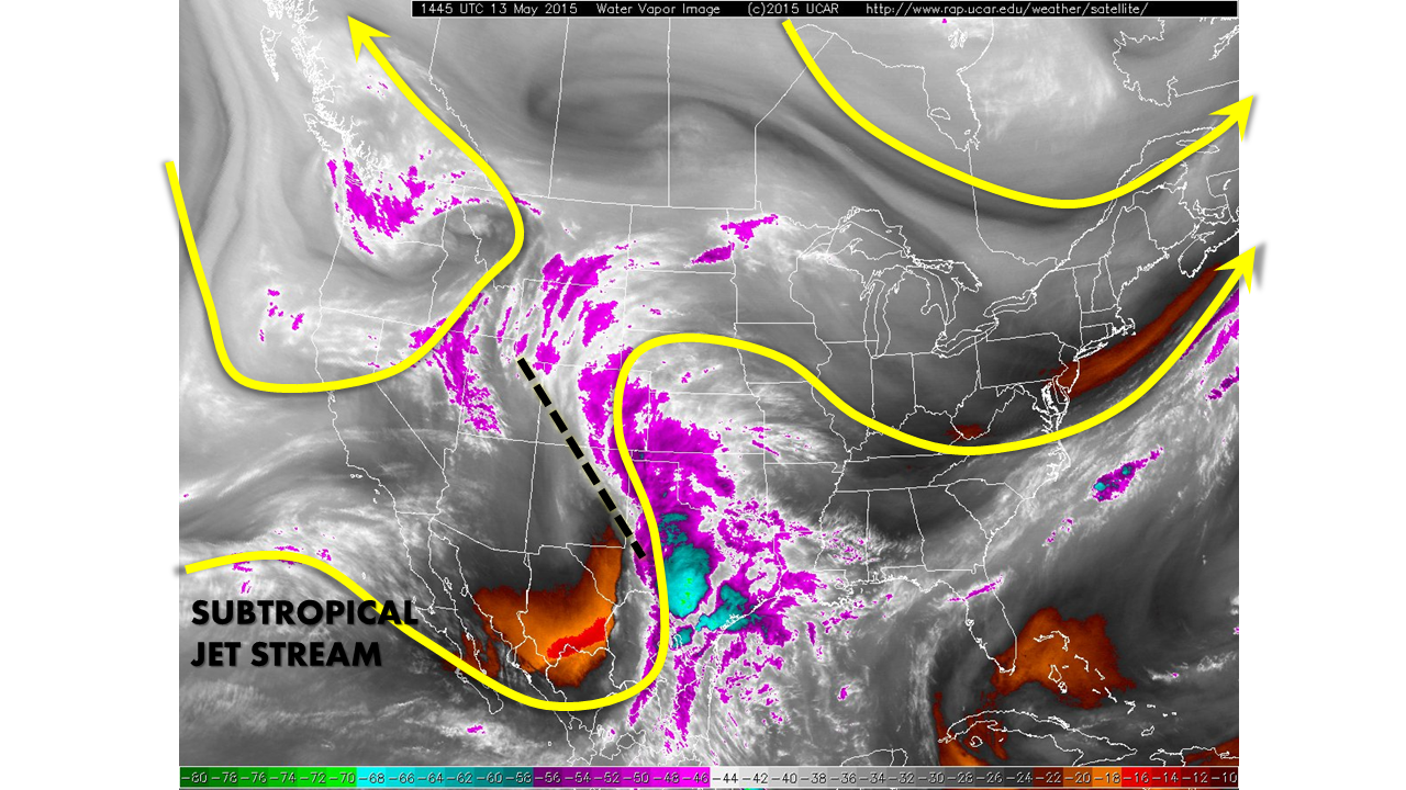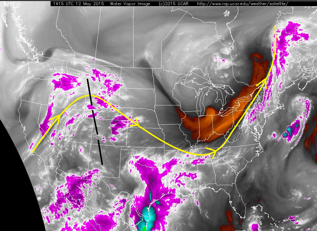 - The “dry slot” (marked by the yellow lines) will move over the top of much of the eastern plains