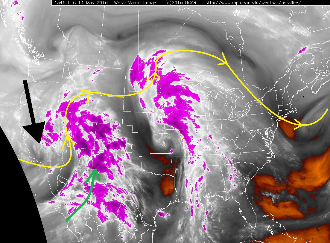 - Broad-scale lift and mid-/upper-level moisture will continue to overspread the state, as shown by the green arrow on the water vapor image below